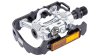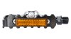 Klickpedale mit Käfig, Aluminiumkörper, Aluminiumrahmen, einstellbare Auslösehärte, 4° seitliche Bewegungsfreiheit, einfaches Ein- und Ausklicken auch bei schlechten Verhältnissen und verschmutzten Schuhsohlen, CrMo-Achse, gedichtetes Industrielager, Größe: 105 x 66 mm, Gewicht: 366 g