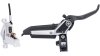 Hydraulisch, 4 Kolben Bremssattel. Bremshebel aus Carbon, Bremshebelgehäuse und Bremssattelgehäuse aus Aluminium. Titan Kleinteile, Kolben aus Phenoplast. Hebelweiteneinstellung, Bremsbelag-Kontaktpunkteinstellung, SwingLink für einen kürzeren Hebelleerweg, MatchMaker X kompatibel, DOT 5.1 Bremsflüssigkeit, Metall, gesinterte Bremsbeläge. Bremsscheibe und Adapter nicht im Lieferumfang enthalten, schwarz / silber
